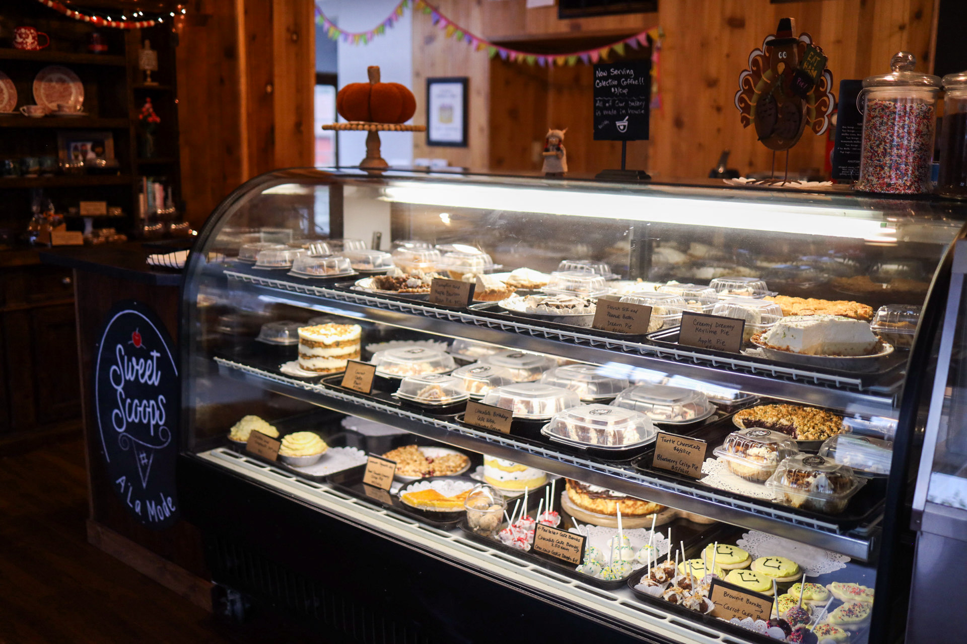 When you walk into Sweet Scoops A’La Mode, you’ll always smell something baking – like you’re walking in to grandma’s kitchen – an apple or a cherry pie, waffle cones, a chocolate cake or some of our mini chicken or shepherd’s pies! We make and bake everything from scratch right here in our kitchen, and of course using our secret ingredient – love!